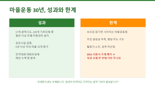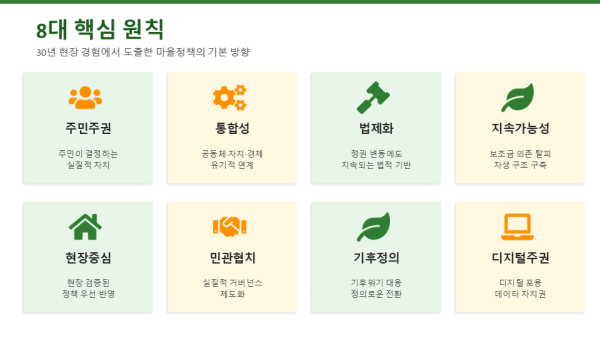 2026 지방선거는 복합위기 시대에 마을의 가치를 공약으로 제시할 수 있는 기회입니다. 100대 정책은 특정 정당의 노선이 아니라, 30년간 현장에서 축적된 초당적 정책 제안입니다.