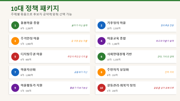 둘째, 정책 차별화 소재. 10대 패키지 중 해당 정당의 노선에 맞는 패키지를 전략적으로 선택하여 차별화된 마을정책을 제시할 수 있습니다.