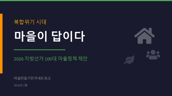마을만들기전국네트워크가 2026 지방선거를 앞두고 「복합위기 시대, 마을이 답이다 — 2026 지방선거 100대 마을정책 제안」 요약편을 공개합니다.